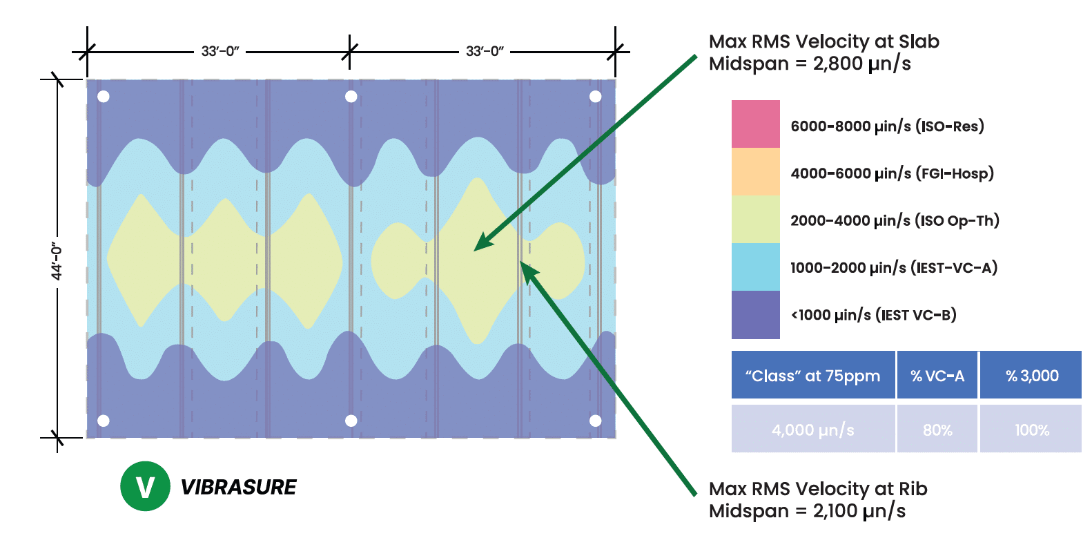 Our structural lab solution offers the most economical solution for achieving premium level vibration performance when compared to all other competing structural systems. The floor framing has been designed for structural efficiency and offers superior strength and stiffness that allows for total grid spacing freedom. As a result, depending on project requirements, floor framing layouts can be configured to achieve RMS velocities as low as 2,000 mips and with significantly fewer columns than competing structural systems.