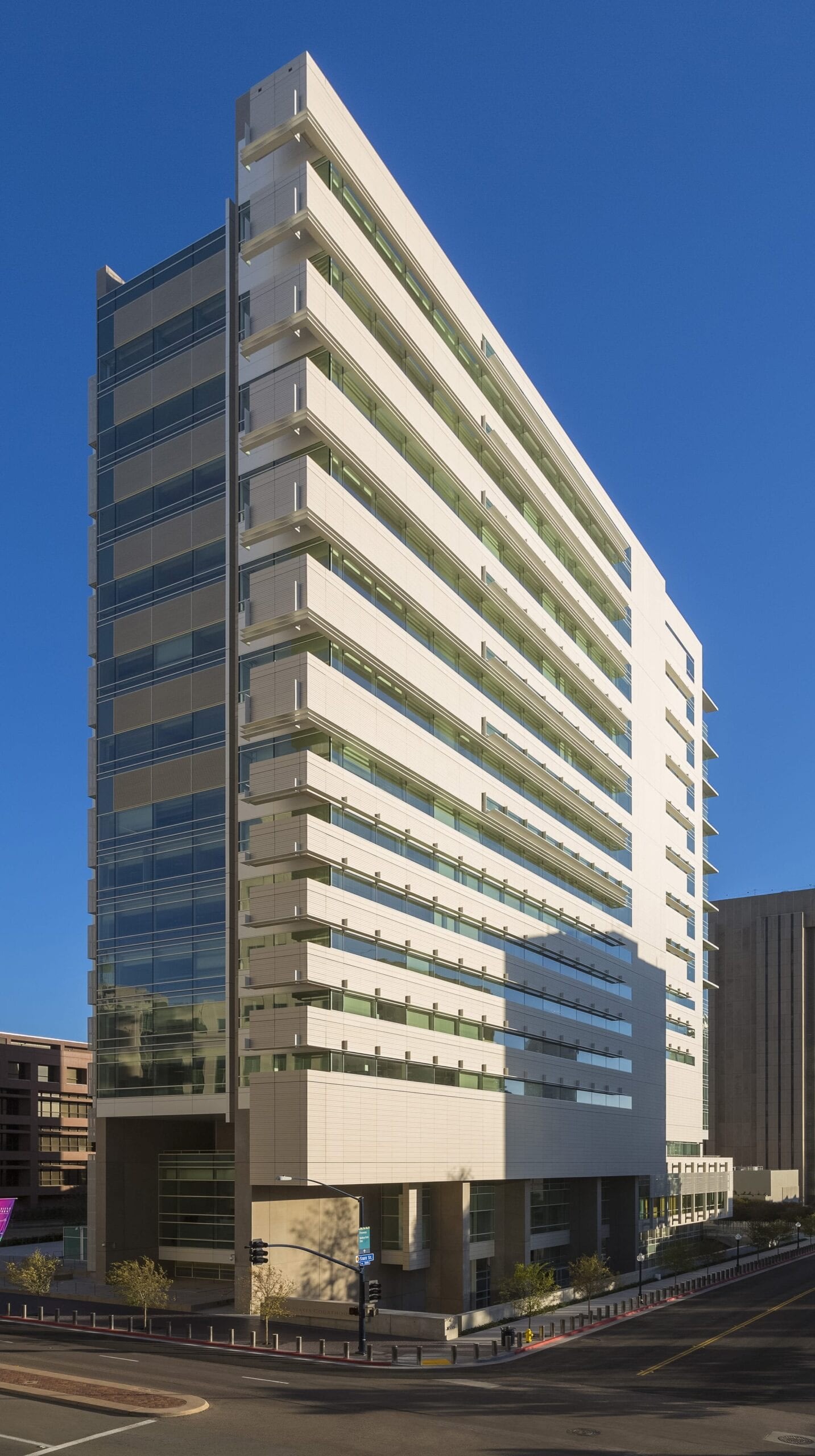 San Diego’s new federal courthouse covers 2.6 urban acres with a build program that links new and existing federal buildings with landscaped gardens, plazas and a series of pedestrian walkways. The structure includes 14 federal courtrooms with an initial build out of 21 chambers.