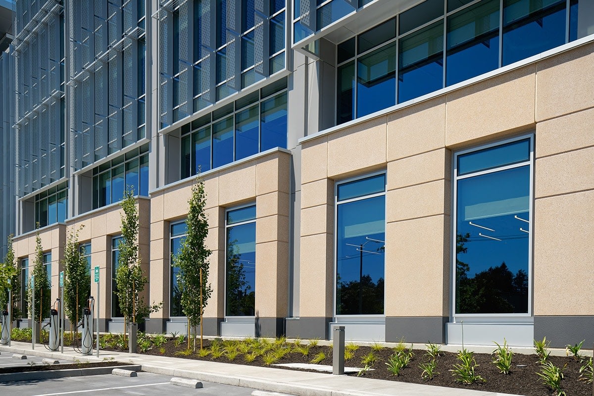 The 172,000 square feet building was constructed by Clark Pacific using a prefabricated construction strategy. Clark Pacific used Infinite Facade, a complete building envelope system, and architectural precast for the exterior design. The wall panels were fabricated at Clark Pacific’s Woodland facility and delivered onsite to be erected. This offsite construction approach reduced construction by 20%. As a result, the building was completed four months faster than traditional construction. In addition, this approach significantly decreased traffic on site and, therefore also decreased carbon emissions.