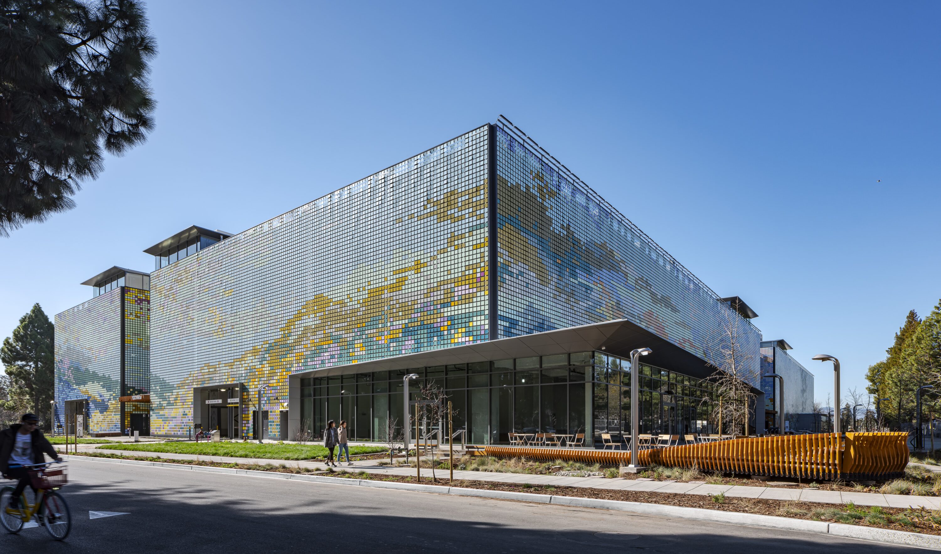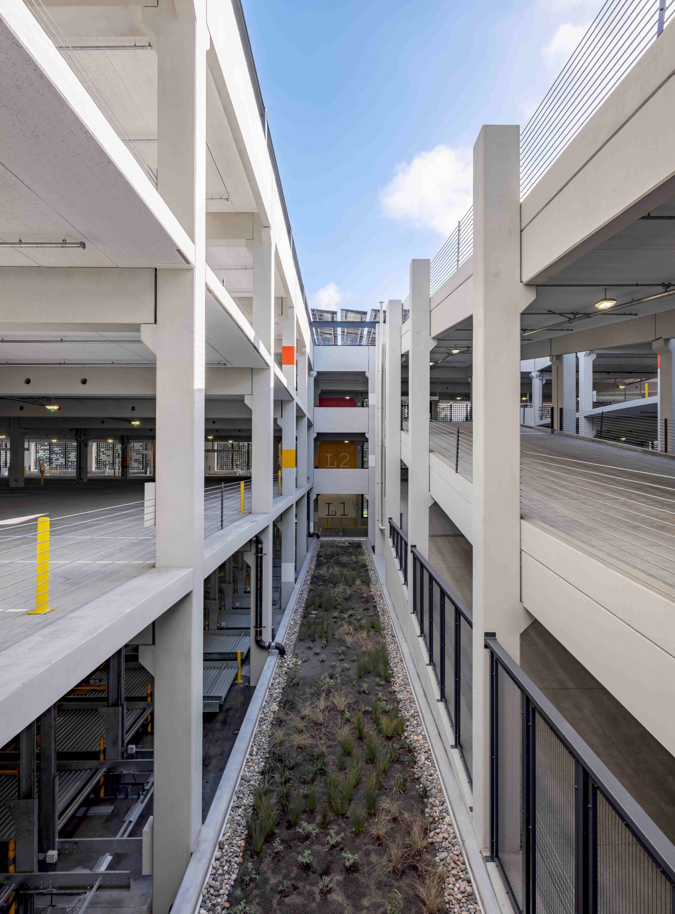 Presently, the parking structure spans 520,000 square feet across 4 levels and comprises of 1209 static stalls and 460 mechanical stackers. Its tall ceiling heights and painted interior create a spacious and bright environment for users, and its dynamic exterior boasts a kinetic facade that replicates murals of the surrounding environment. Additionally, a pedestrian green way connects the site to other areas on the campus, and the building includes extensive landscaping and user amenities, such as a 1-megawatt solar structure and 10,000 square feet of retail space on the first level.