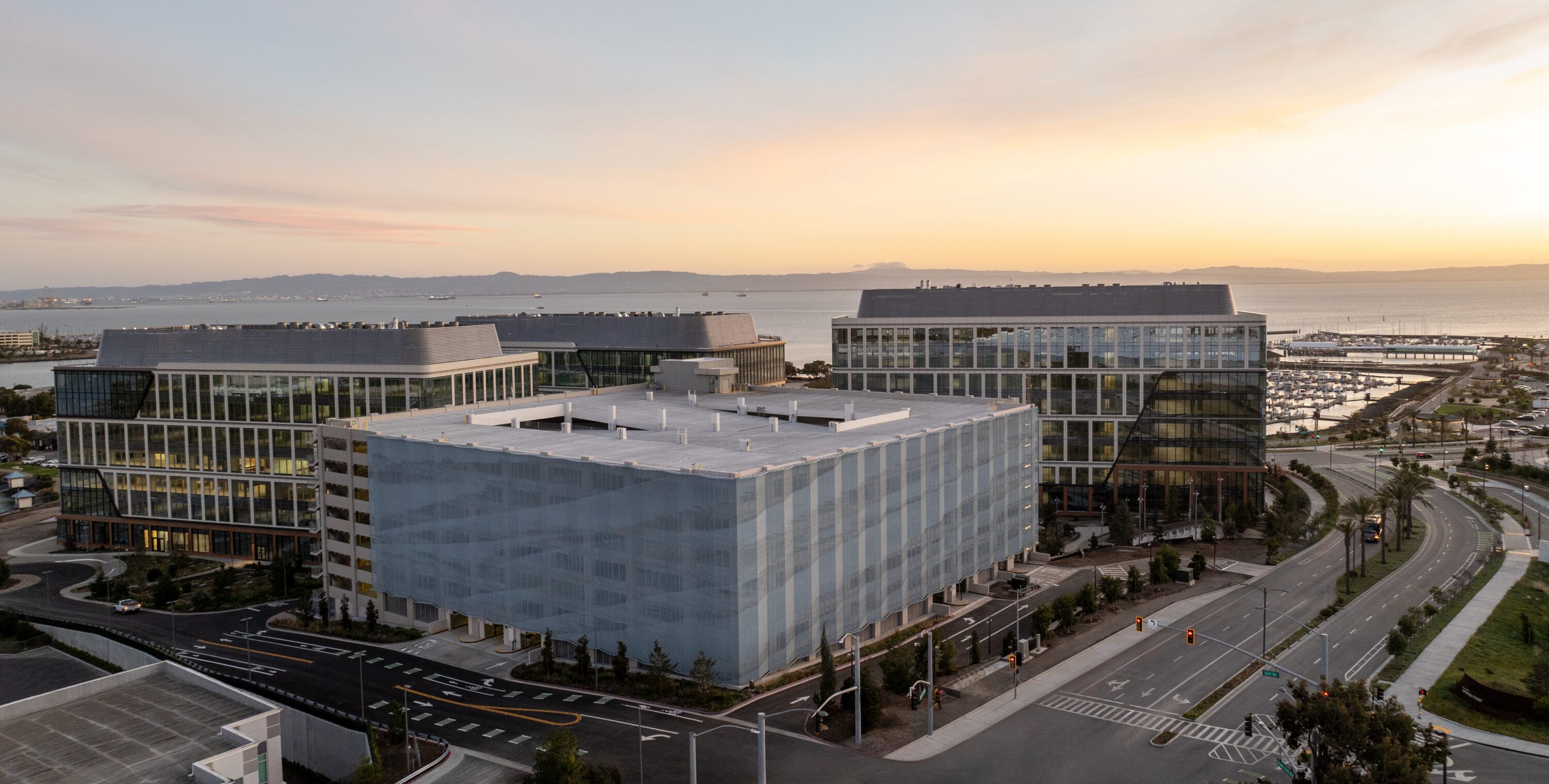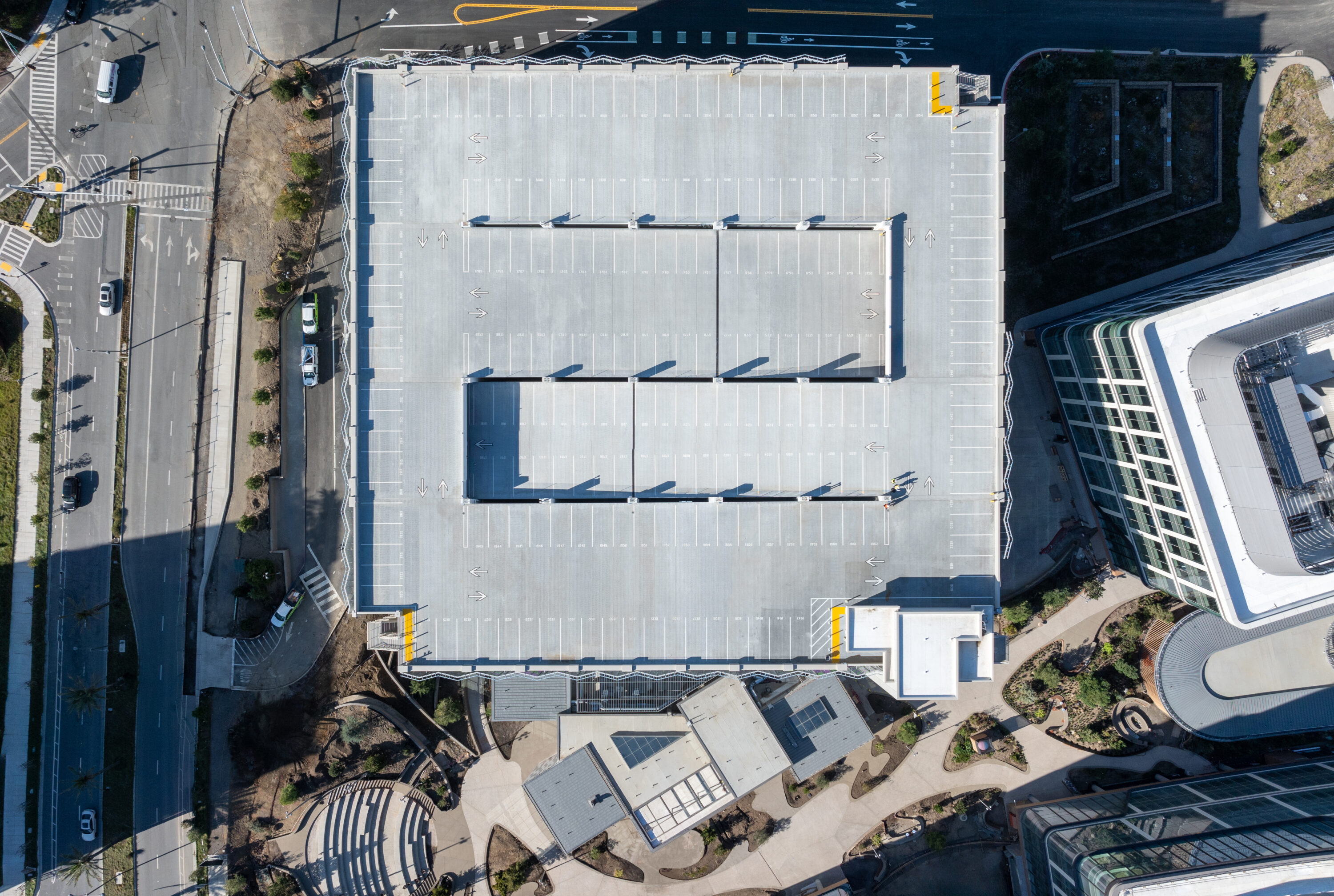 The Kilroy Oyster Point Phase Two Parking Structure in South San Francisco is a premier example of Clark Pacific’s PARC and design-build approach, providing 1,961 parking spaces and 865,000 square feet of laboratory space for the region’s growing biotechnology sector. Thoughtfully integrated into the hillside, the structure minimizes perceived height by placing its main entrance on Level Three, while multiple access points, reversible lanes, and dynamic LED signage ensure smooth vehicle flow. Pedestrian and vehicle circulation are enhanced through central ramps, stair towers, and five elevators.