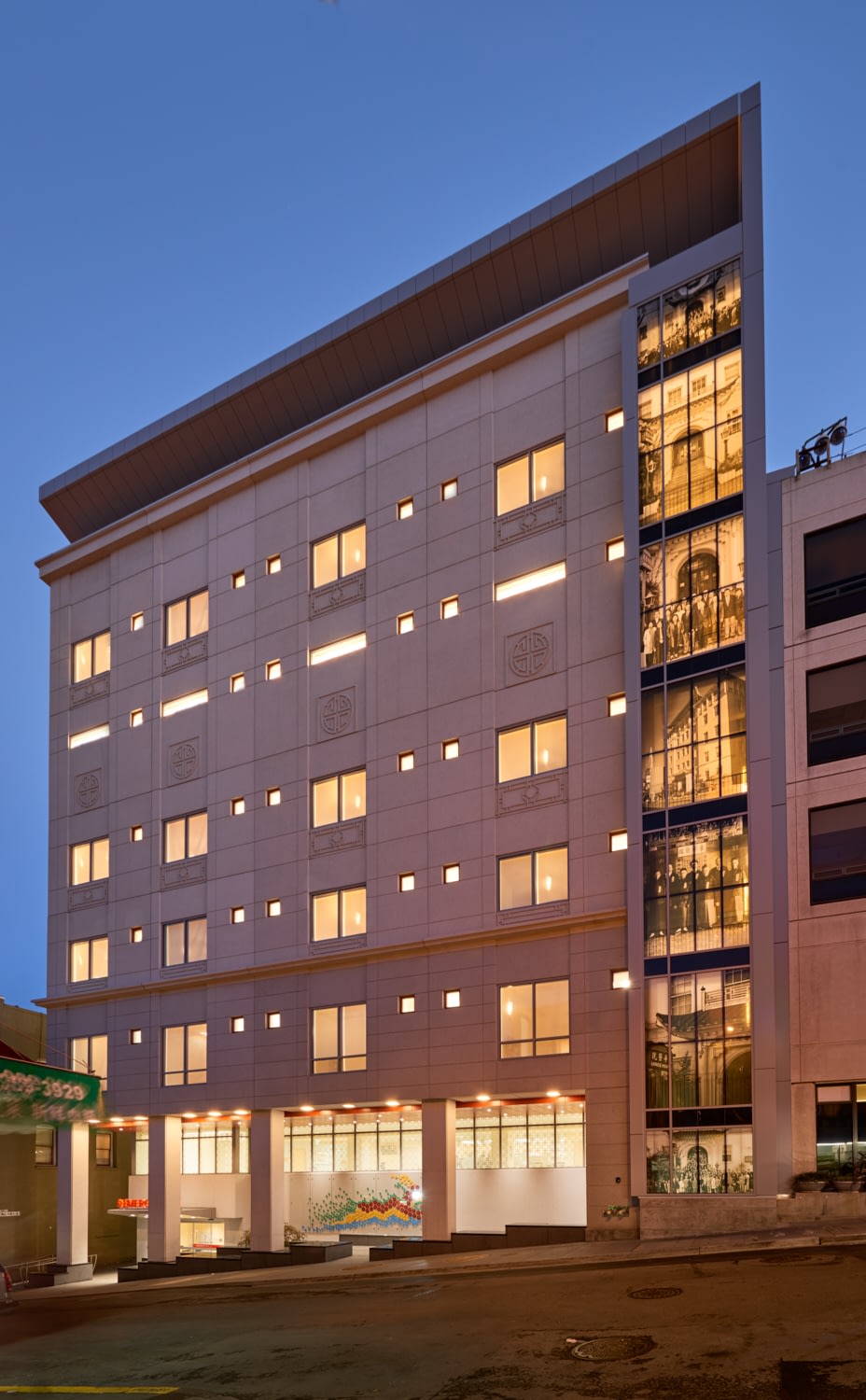 San Francisco Chinese Hospital tower located in the heart of Chinatown, replacing the original 1925 building due to seismic concerns. A key challenge of the project was construction on a tight urban site, bound on three sides: by a hospital in continual operation on one side, residences on another, and an elementary school directly behind.