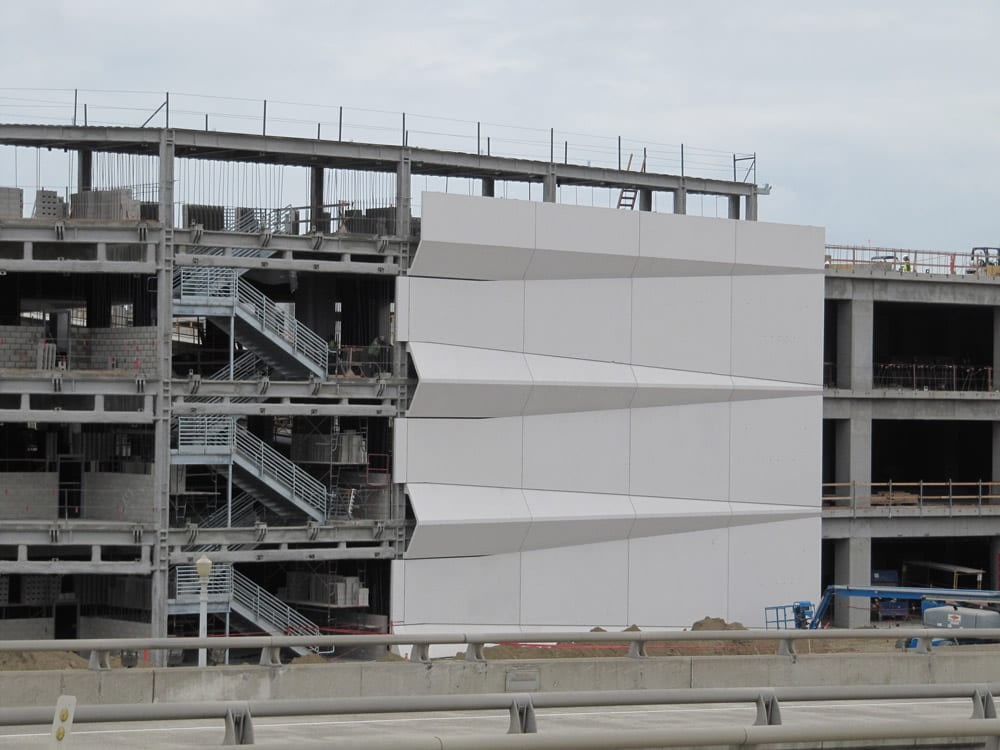 Clark Pacific was contracted to provide approximately 210,000SF of high-quality white architectural precast concrete to clad the massive four story CIP parking structure. The structure itself contains over 2 million square feet of space that will house more than twelve (12) rental car agencies and their fleets of vehicles to service the San Diego International Airport. The project consisted of nearly 850 erectable panels, with 300 plant assemblies (grey crash-wall pieces) required in the process; equating to nearly 1150 distinct pieces that had to be cast for the project. The panel shapes and architectural profiles on the project were very complex and large in scale. The typical spandrel panels are nearly nine feet tall, have a white architectural finish and a triangular cross-sectional shape. Most of these spandrels also received grey crash-wall panels that were plant-assembled before making the trip to the jobsite. The majority of the precast for the project was fabricated in Fontana; however, West Sacramento produced the helix spandrels as well as some of the parapet panels. There were also approximately eighty infill column cover panels that had a “diamond” shape and were attached top and bottom to the adjacent spandrel panels. Vehicles will enter and exit the parking structure by way of two helical drive ramps that service all four floors of the building. These CIP drive ramps are also clad in our white architectural precast spandrel panels. The panels have a cross section similar to those on the main building; however, these spandrels have to follow the trajectory of the ramp’s corkscrew shape. Thus, the helix spandrels have a triangular section that follows a radius with a “twist” built into the profile in order to follow the ramp as it climbs from floor to floor. Even though they were very complicated to design, fabricate, and install, the helix panels were not the most complex panels on the project. That distinction belongs to the shaped infill wall panels that clad the various stair towers and building corners that occur all around the building’s perimeter. These panels are trapezoidal in shape and have vertical and horizontal ribs at the back of panel in order to connect to the spandrels above and below. This panel type proved to be extremely difficult to deal with in each phase of our work, from design to installation. The intricate shapes and architectural features present on this building make it truly unique.