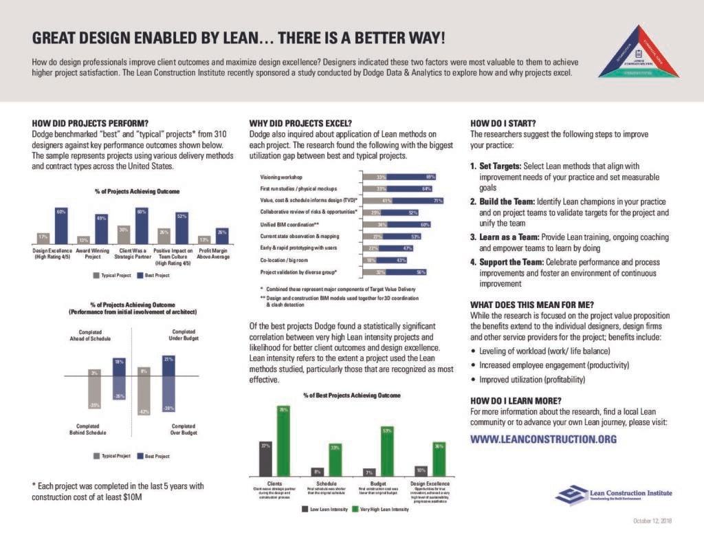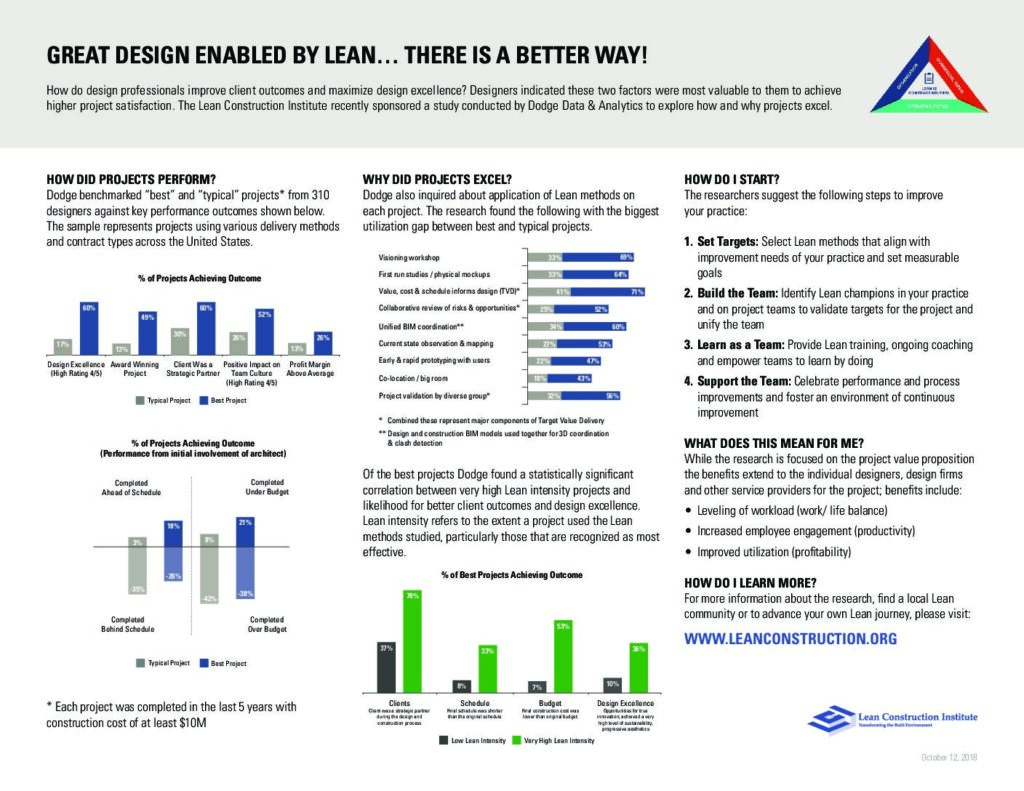 How do you increase speed to market and/ or improve the return on investment of your capital projects? The Lean Construction Institute sponsored two separate research studies, conducted by Dodge Data & Analytics and the University of Minnesota, to explore how and why projects excel. Empirical evidence now shows that projects with high Lean intensity are three times more likely to complete ahead of schedule and two times more likely to complete under budget.