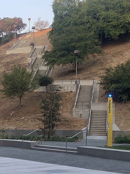 The route from the parking lot up the hill to the main campus had involved climbing a long series of concrete stairs — nicknamed “Cardiac Hill” — that were not easily used by students with disabilities. So the tower’s elevators are intended to provide universal access, Orue explains.