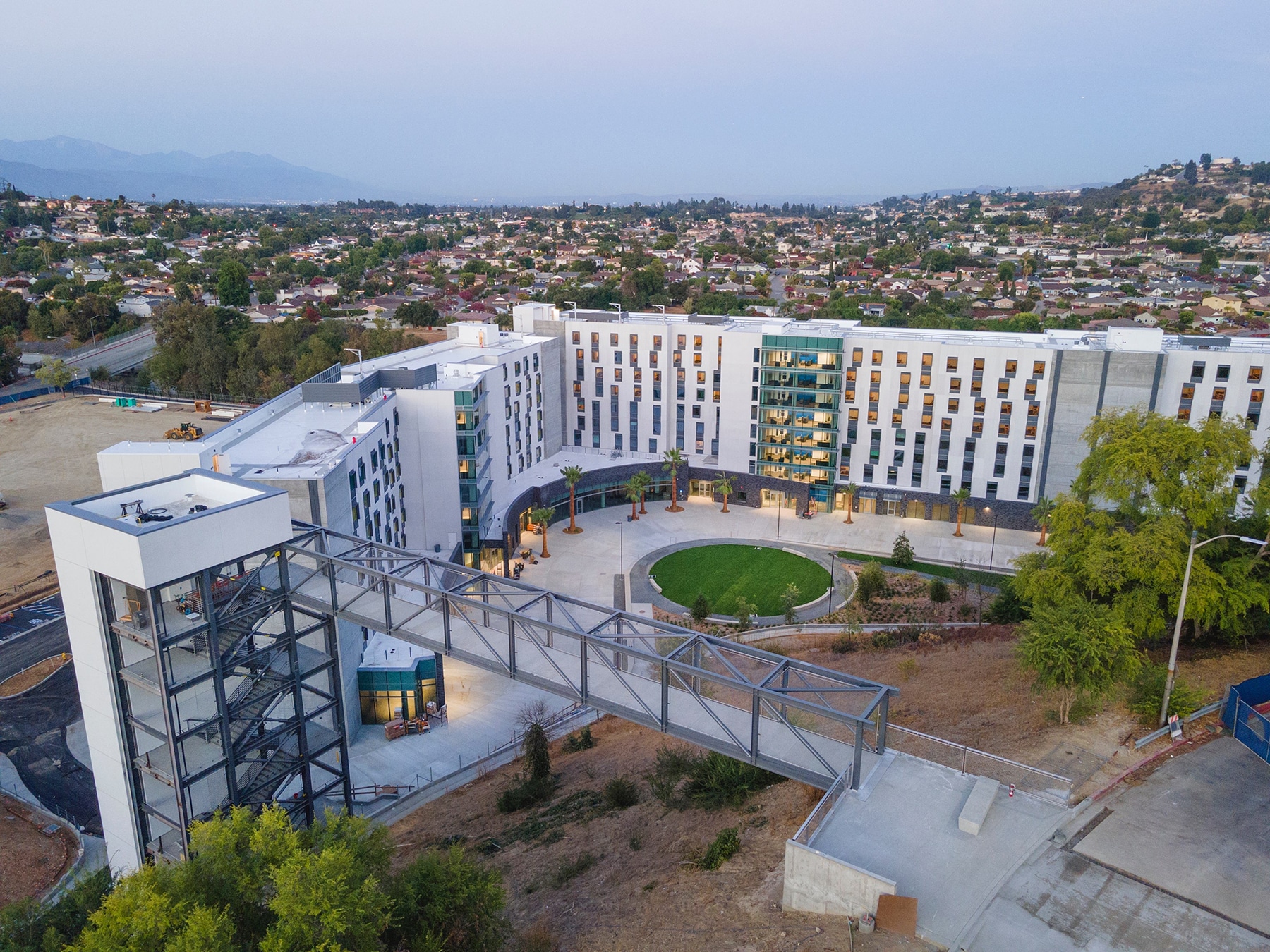 The site of the new Student Housing East dorms — three structurally separate buildings — and the adjoining but freestanding tower and pedestrian bridge had previously been a surface parking lot on the northeastern side of the campus, near the Interstate 710 freeway.